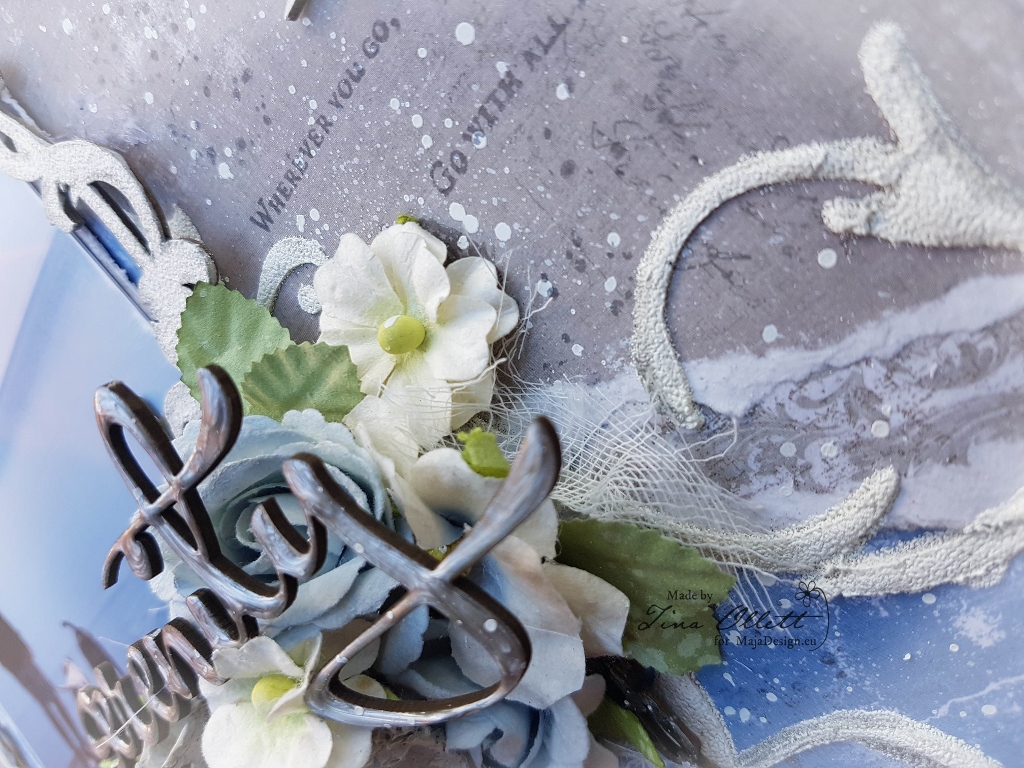 I did some tearing using two sheets of Maja Designs. One from Vintage Autumn Basics and the other from Vintage Summer Basics. They were torn and layered on a sheet of chipboard. I primed my background with clear gesso and then added in a flourish using a Donna Downey stencil and Ranger Texture Paste. I also gave it a little more texture and colour by adding over a little Seafoam embossing powder. My gorgeous and most favourite Dusty Attic Baroque Circle frame was also dressed in Seafoam embossing powder and outlined with a little Archival Potting Mix ink.
